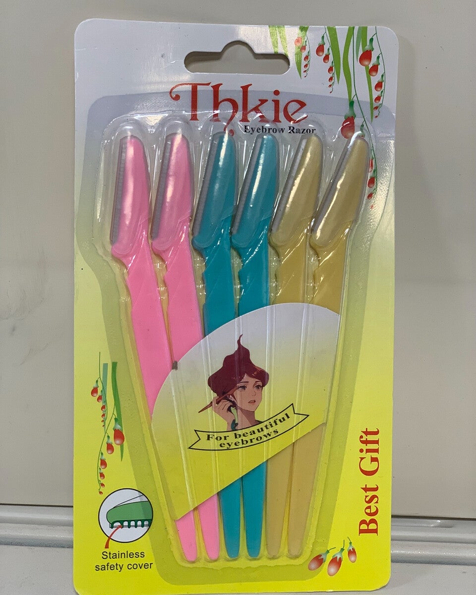 Rasoirs fins pour entretenir et dessiner les sourcils avec précision. Lame en acier inoxydable avec capuchon de sécurité. Format économique et coloré.