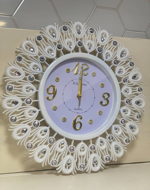 Cette superbe horloge ronde au cadre blanc orné de motifs en relief et de strass apporte une touche d’élégance baroque à votre intérieur. Chiffres dorés et mouvement quartz pour une lecture facile et précise.